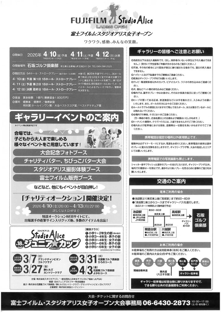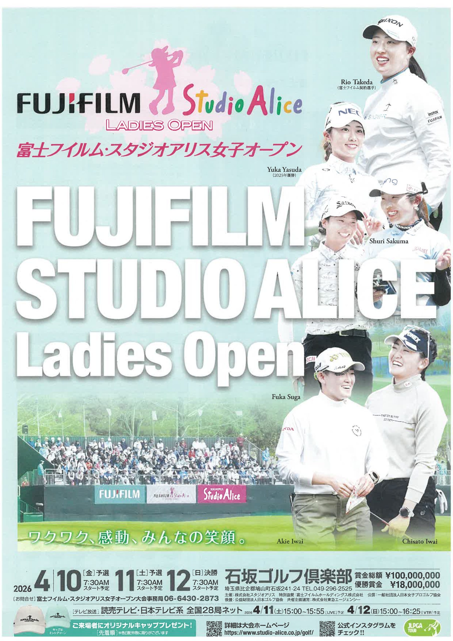 富士フイルム・スタジオアリス女子オープン前売り観戦券のご案内新着情報 主催:株式会社スタジオアリス特別協賛:富士フイルムホールデイングス株式会社開催日:2026年4月10日(金)・11日(土)・12日(日)観戦券:1冊7,000円(消費税込み/3日間共通前売券/2枚綴)販売場所:石坂ゴルフ倶楽部フロント2026年2月3日(火)販売開始予定